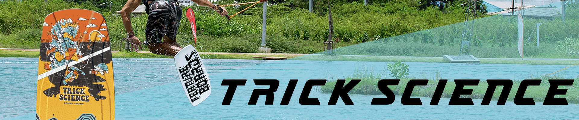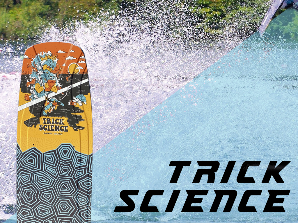 The TRICK SCIENCE by Feature Boards was developed in close collaboration with team rider Daniel Grant to consistently realize his new, progressive approach to trick ski riding in the wake park. The goal of the development was to create a board that offers maximum stability on features, enables very high and technical tricks, and still reacts softly and in a controlled manner on landings. Special attention was paid to ensuring that the specially tuned shape provides a secure and confident feel on rails and obstacles without losing its playful character. The three-dimensionally milled top contour allows different zones to deliver varying flex characteristics, while integrated carbon inserts provide the board with the necessary stability, control, and durability. The result is an extremely robust Feature Board designed for long-term use in cable parks, tailored specifically to the demands of athletic riders, and available in sizes 42 and 43 inches.